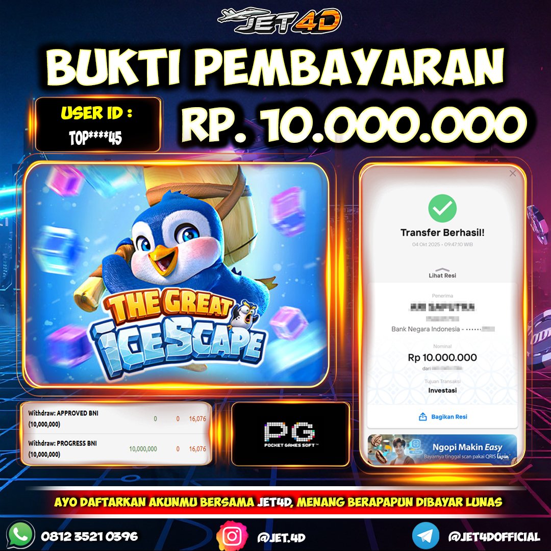 JET4D SENSASI BERMAIN THE GREAT ICESCAPE Selamat Kepada Member Setia Atas Withdraw Rp 10.000.000 Hari ini. List member yang sebelumnya mendapatkan withdraw besar bisa cek Disini dan di LINK ini.pelanyanan