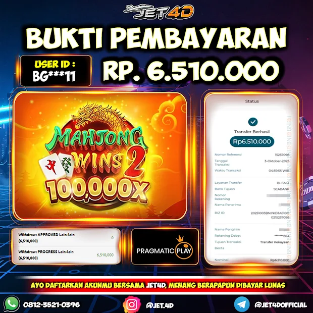 JET4D Mahjong Wins 2 Selamat Kepada Member Setia Atas Withdraw Rp 6.510.000 Hari ini. List member yang sebelumnya mendapatkan withdraw besar bisa cek Disini dan di LINK ini.pelanyanan nonstop dan profesional