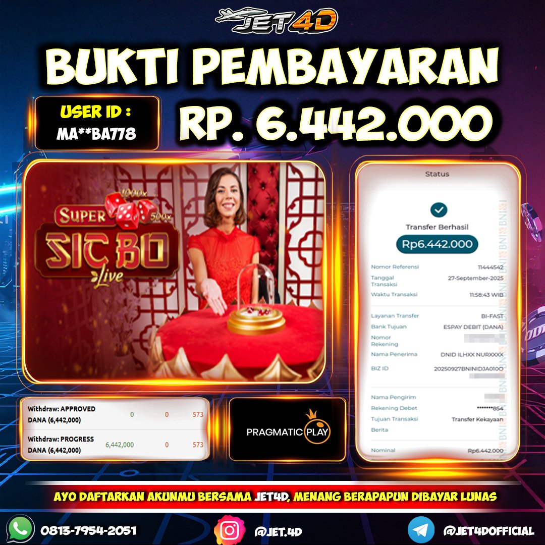 JET4D BUKTI KEMENANGAN SUPER SICBO Selamat Kepada Member Setia Atas Withdraw Rp 6.442.000 Hari ini. List member yang sebelumnya mendapatkan withdraw besar bisa cek Disini dan di LINK ini.pelanyanan nonstop