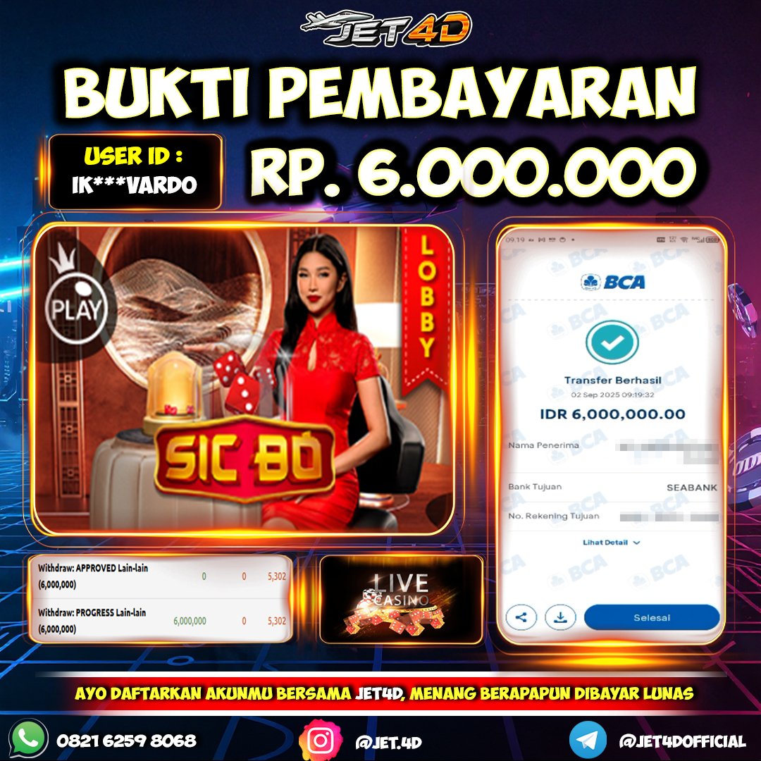 JET4D BUKTI KEMENANGAN CASINO SIC BO Selamat Kepada Member Setia Atas Withdraw Rp 6.000.000 Hari ini. List member yang sebelumnya mendapatkan withdraw besar bisa cek Disini dan di LINK ini.pelanyanan