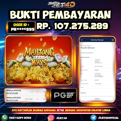 JET4D MAHJONG TERGACOR #1 Selamat Kepada Member Setia Atas Withdraw Rp 107.275.289 Hari ini. List member yang sebelumnya mendapatkan withdraw besar bisa cek Disini dan di LINK ini.pelanyanan nonstop dan