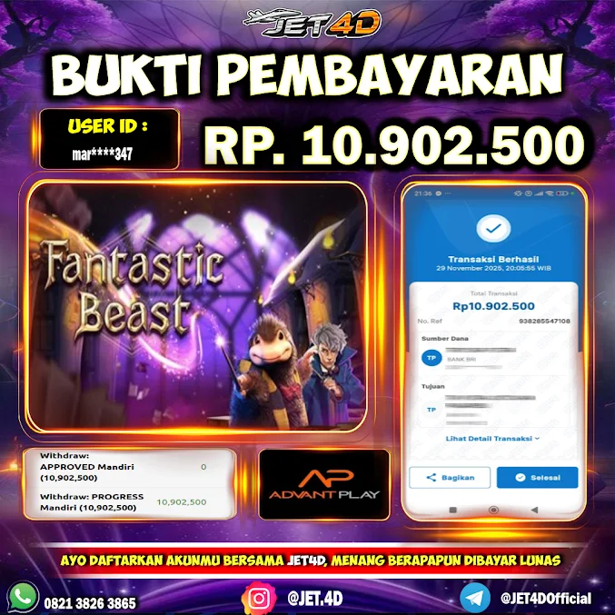 JET4D SLOT Fantastic Beast Selamat Kepada Member Setia Atas Withdraw Rp 10.900.000Hari ini. List member yang sebelumnya mendapatkan withdraw besar bisa cek Disini dan di LINK ini.pelanyanan nonstop dan profesional