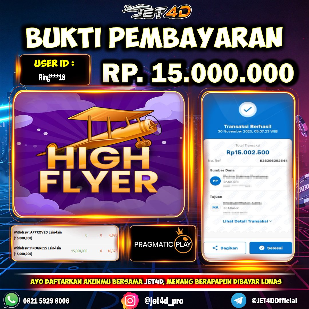 JET4D TERBANGKAN CUANMU SEKARANG Selamat Kepada Member Setia Atas Withdraw Rp 15.000.000 Hari ini. List member yang sebelumnya mendapatkan withdraw besar bisa cek Disini dan di LINK ini.pelanyanan nonstop dan
