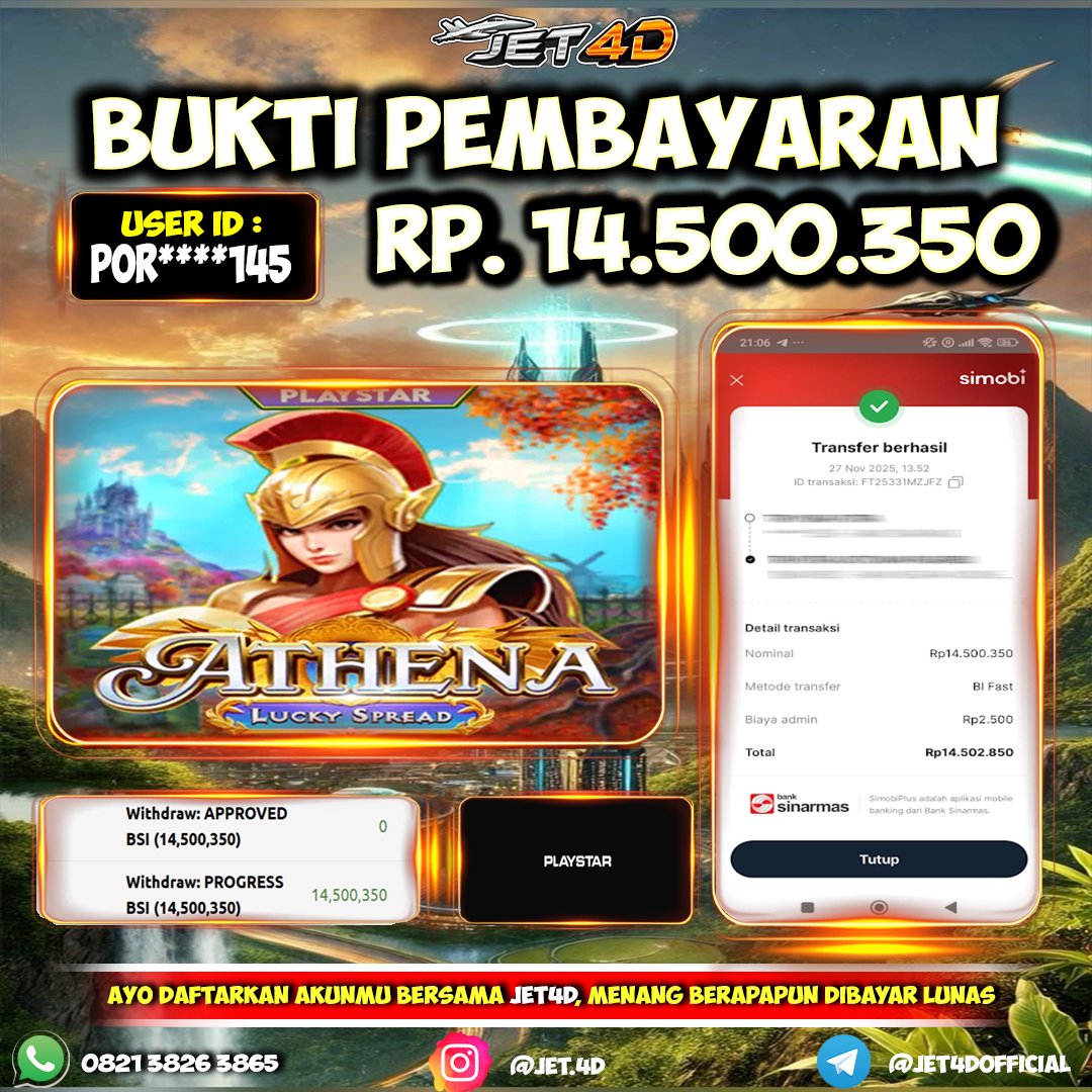 JET4D Athena Lucky Spread Selamat Kepada Member Setia Atas Withdraw Rp. 14.500.350 Hari ini List member yang sebelumnya mendapatkan withdraw besar bisa cek Disini dan di LINK ini.pelanyanan nonstop dan profesional hanya