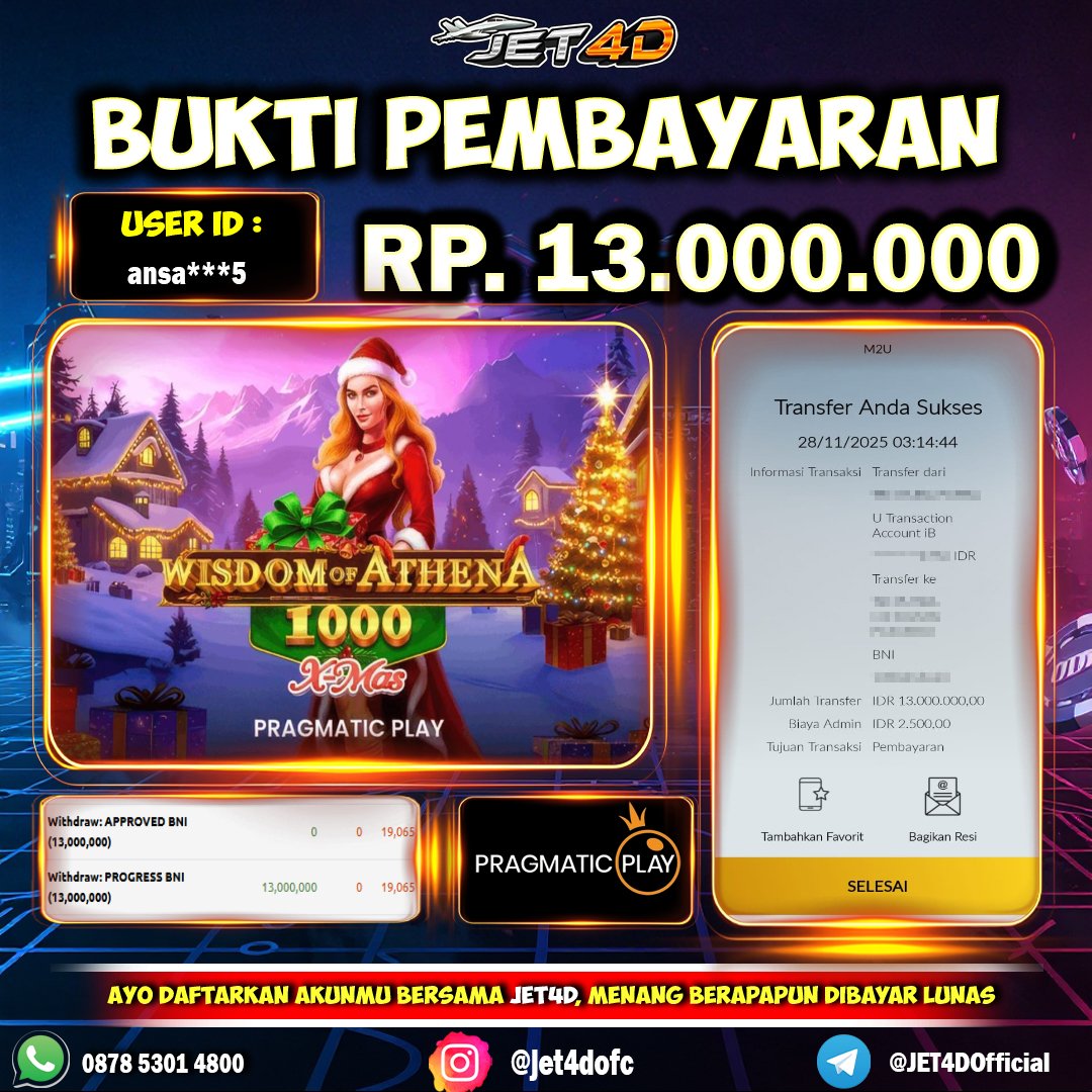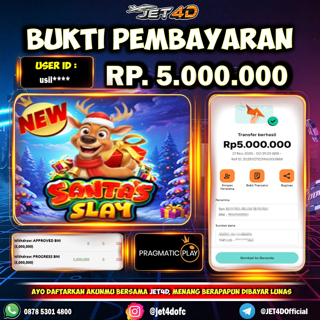 JET4D HADIAH NATAL DARI SANTA’S SLAY Selamat Kepada Member Setia Atas Withdraw Rp 5.000.000 Hari ini. List member yang sebelumnya mendapatkan withdraw besar bisa cek Disini dan di LINK ini.pelanyanan nonstop