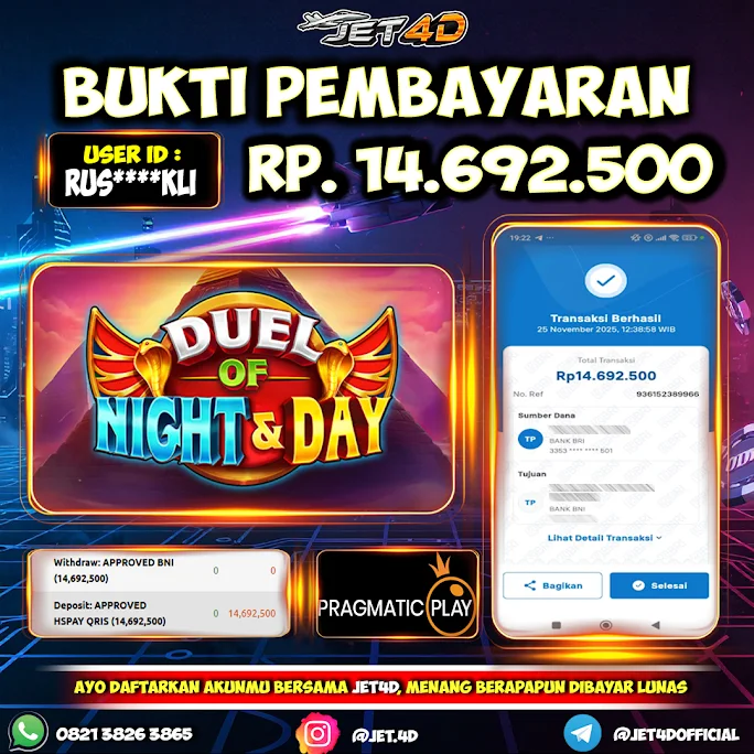 JET4D Duel of Night & Day Selamat Kepada Member Setia Atas Withdraw Rp 14.692.500 Hari ini. List member yang sebelumnya mendapatkan withdraw besar bisa cek Disini dan di LINK ini.pelanyanan nonstop