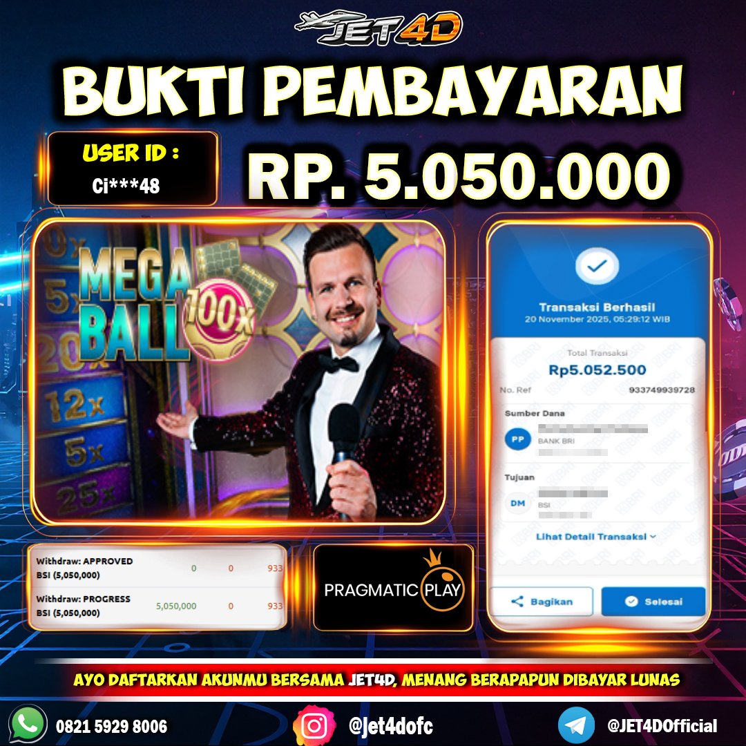 JET4D MEGA JACKPOT DARI MEGA BALL Selamat Kepada Member Setia Atas Withdraw Rp 5.050.000 Hari ini. List member yang sebelumnya mendapatkan withdraw besar bisa cek Disini dan di LINK ini.pelanyanan