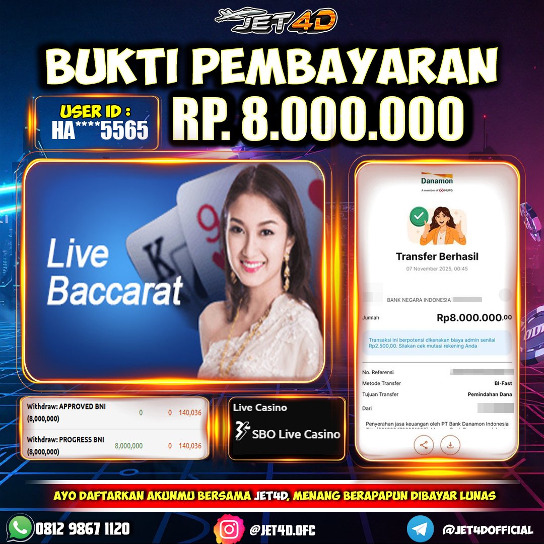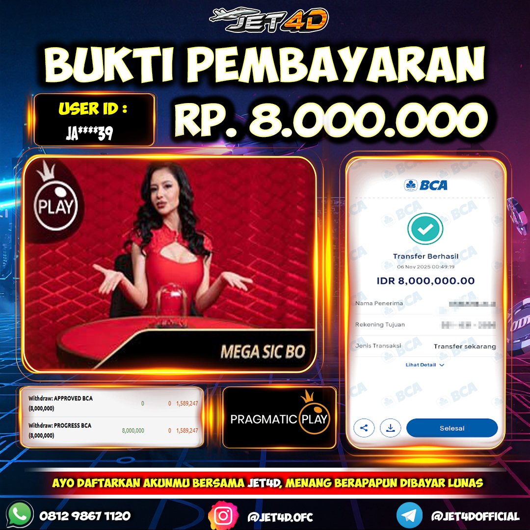 JET4D TARUHAN NYATA KEMENANGAN NYATA Selamat Kepada Member Setia Atas Withdraw Rp 8.000.000 Hari ini. List member yang sebelumnya mendapatkan withdraw besar bisa cek Disini dan di LINK ini.pelanyanan nonstop