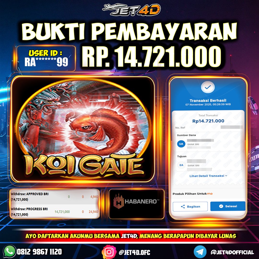 JET4D SENSASI IKAN KOI PEMBAWA HOKI Selamat Kepada Member Setia Atas Withdraw Rp 14.721.000 Hari ini. List member yang sebelumnya mendapatkan withdraw besar bisa cek Disini dan di LINK ini.pelanyanan