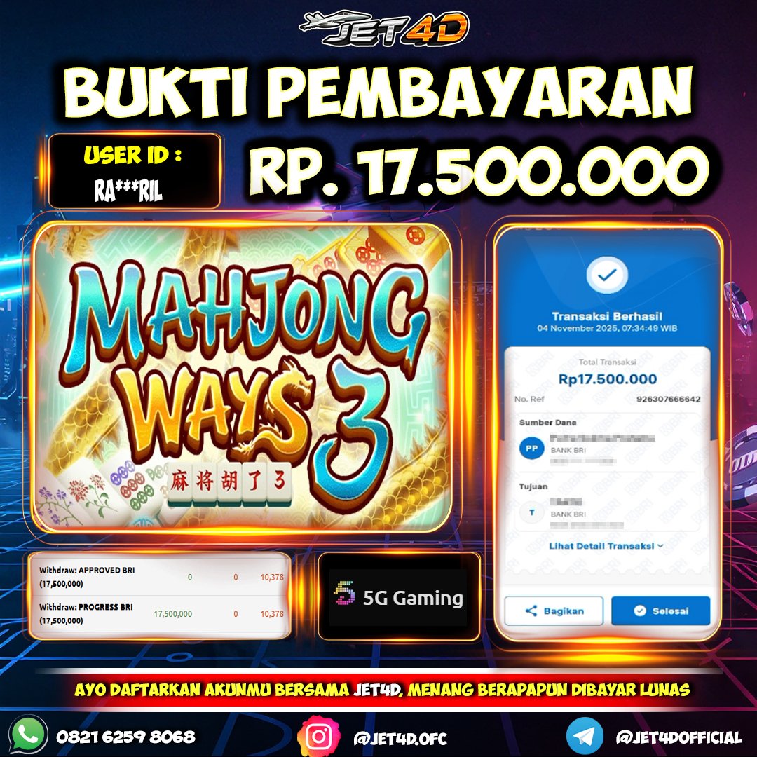 JET4D MAHJONG TERGACOR #1 ASIA Selamat Kepada Member Setia Atas Withdraw Rp 17.500.000 Hari ini. List member yang sebelumnya mendapatkan withdraw besar bisa cek Disini dan di LINK ini.pelanyanan nonstop