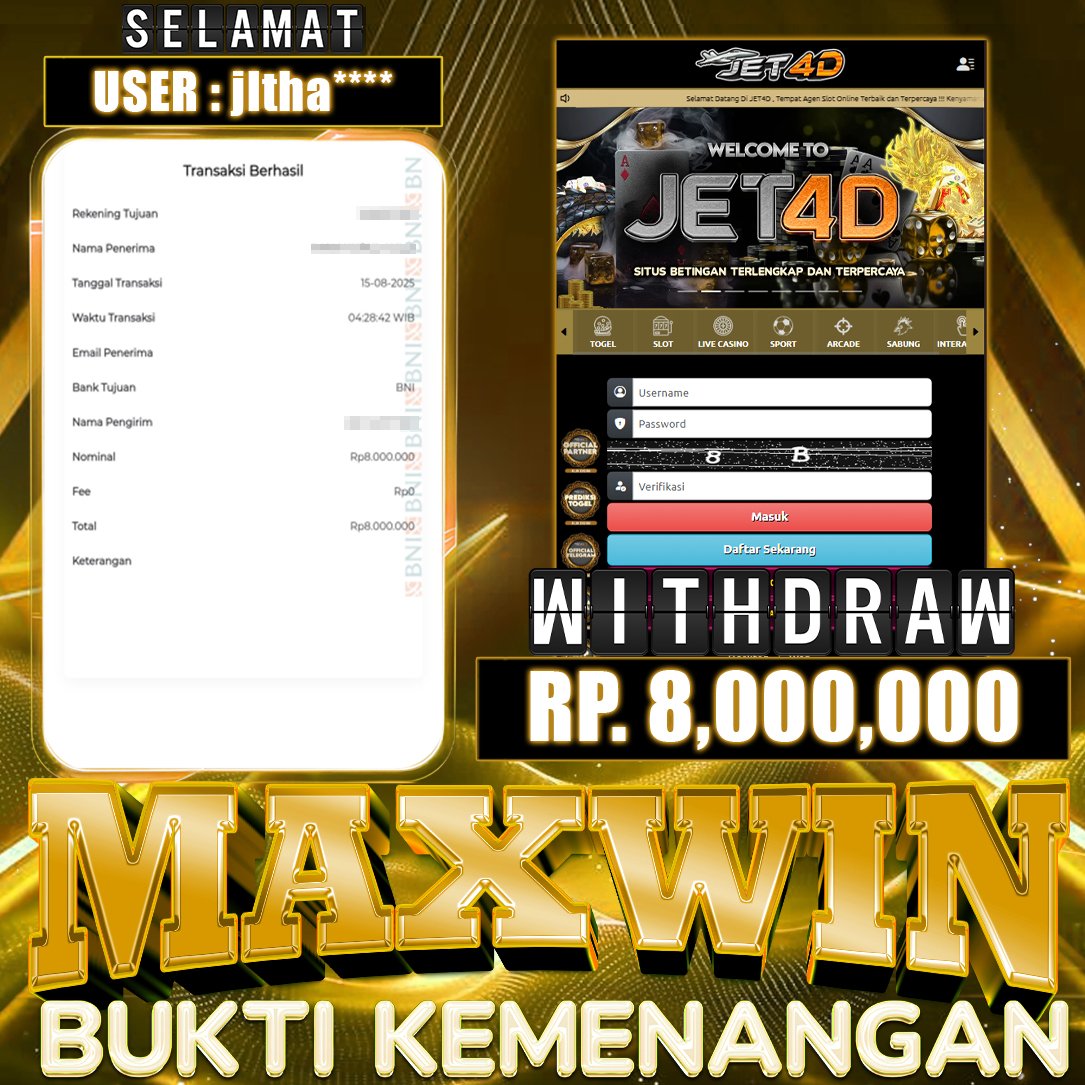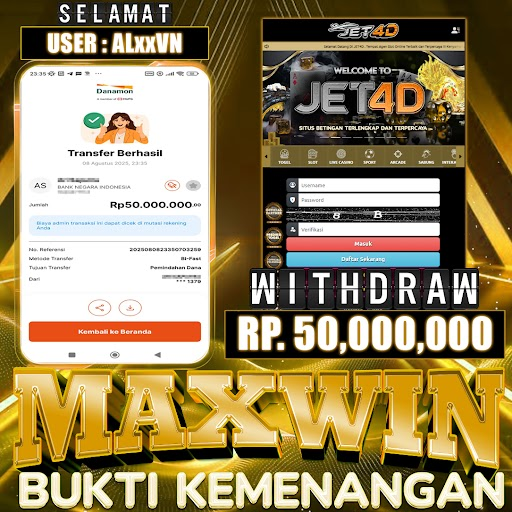 JET4D MINIMAL BET 100 PERAK Selamat Kepada Member Setia Atas Withdraw Rp 20.000.000 Hari ini. List member yang sebelumnya mendapatkan withdraw besar bisa cek Disini dan di LINK ini.pelanyanan nonstop dan