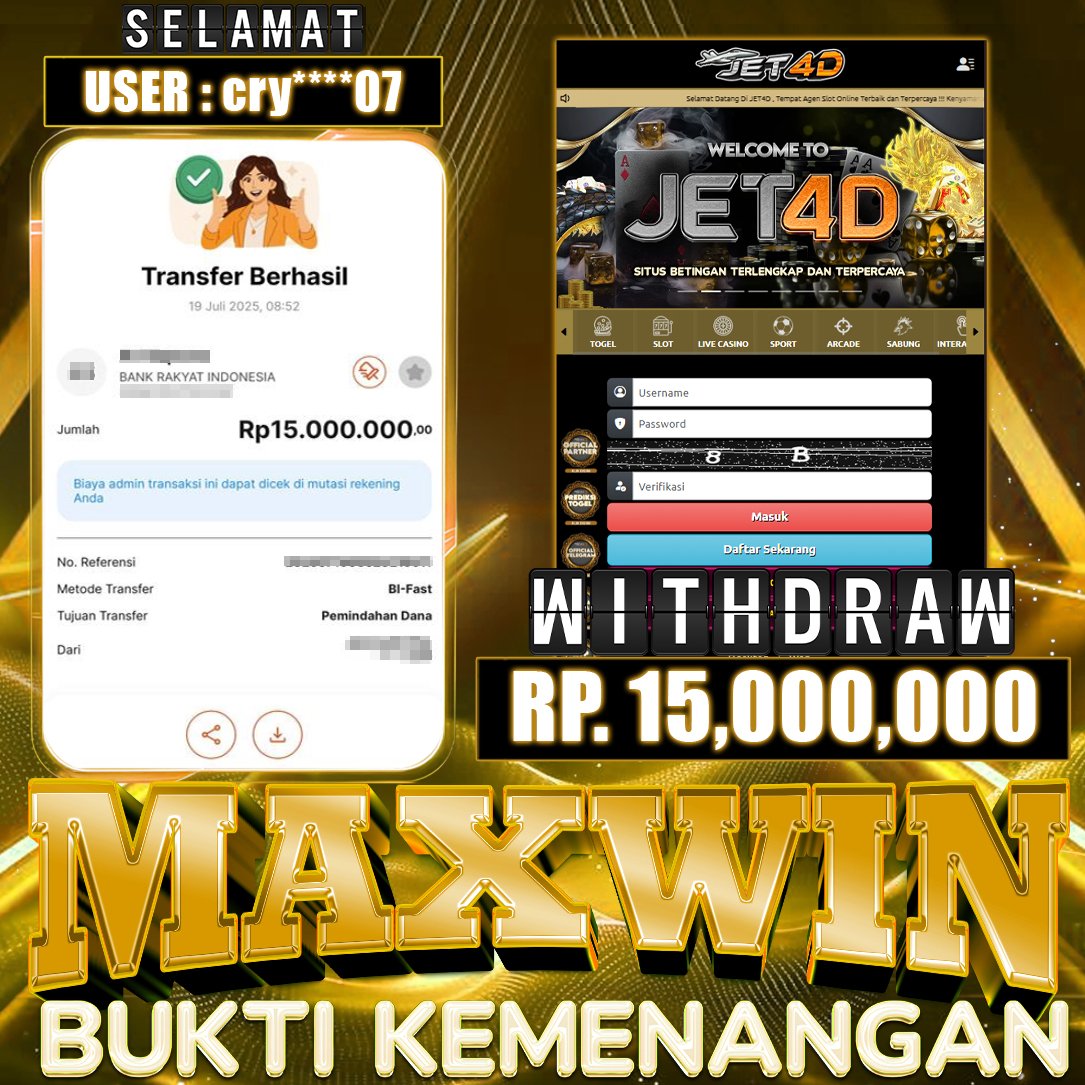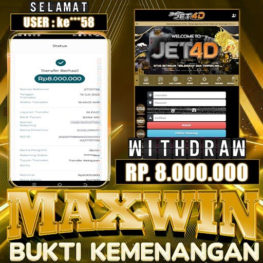 JET4D SPECIAL BONUS LUCKY SPIN Selamat Kepada Member Setia Atas Withdraw Rp 50.000.000 Hari ini. List member yang sebelumnya mendapatkan withdraw besar bisa cek Disini dan di LINK ini.pelanyanan nonstop dan