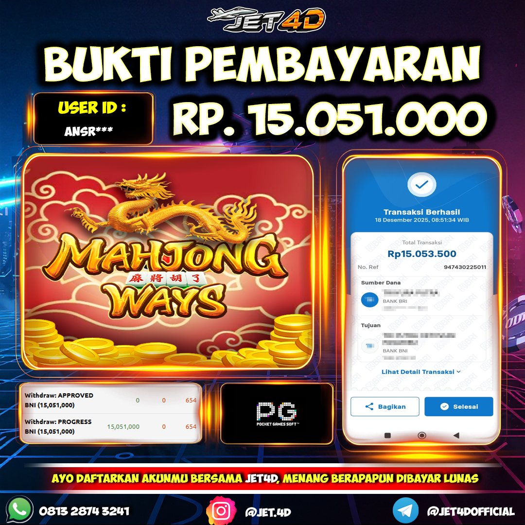 JET4D NO MAHJONG NO PARTY Selamat Kepada Member Setia Atas Withdraw Rp 15.051.000 Hari ini. List member yang sebelumnya mendapatkan withdraw besar bisa cek Disini dan di LINK ini.pelanyanan nonstop