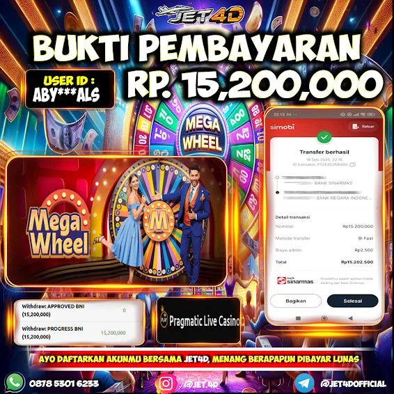 JET4D Mega Wheel Selamat Kepada Member Setia Atas Withdraw Rp 17.100.000 Hari ini. List member yang sebelumnya mendapatkan withdraw besar bisa cek Disini dan di LINK ini.pelanyanan nonstop dan profesional