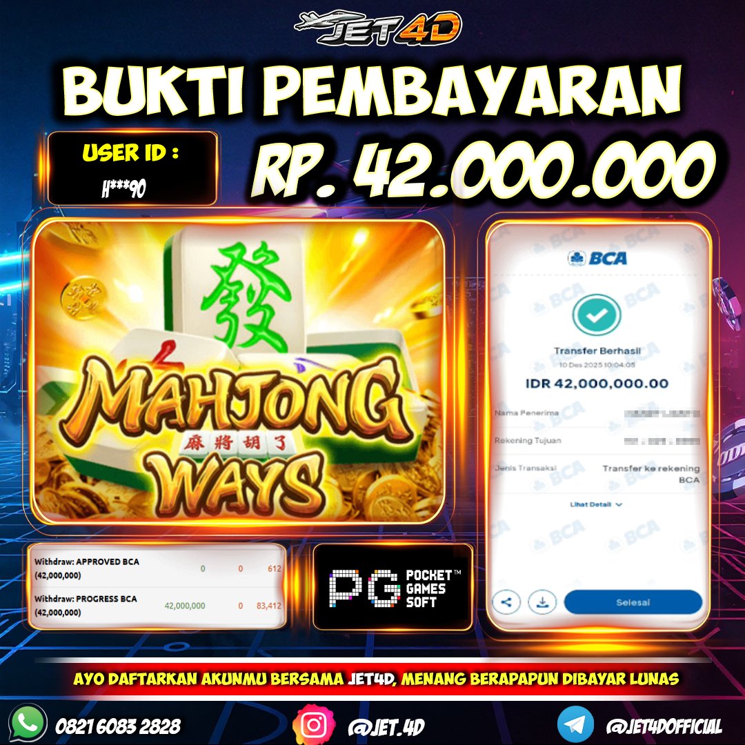 JET4D MAHJONG TERGACOR #1 SE ASIA Selamat Kepada Member Setia Atas Withdraw Rp 42.000.000 Hari ini. List member yang sebelumnya mendapatkan withdraw besar bisa cek Disini dan di LINK ini.pelanyanan