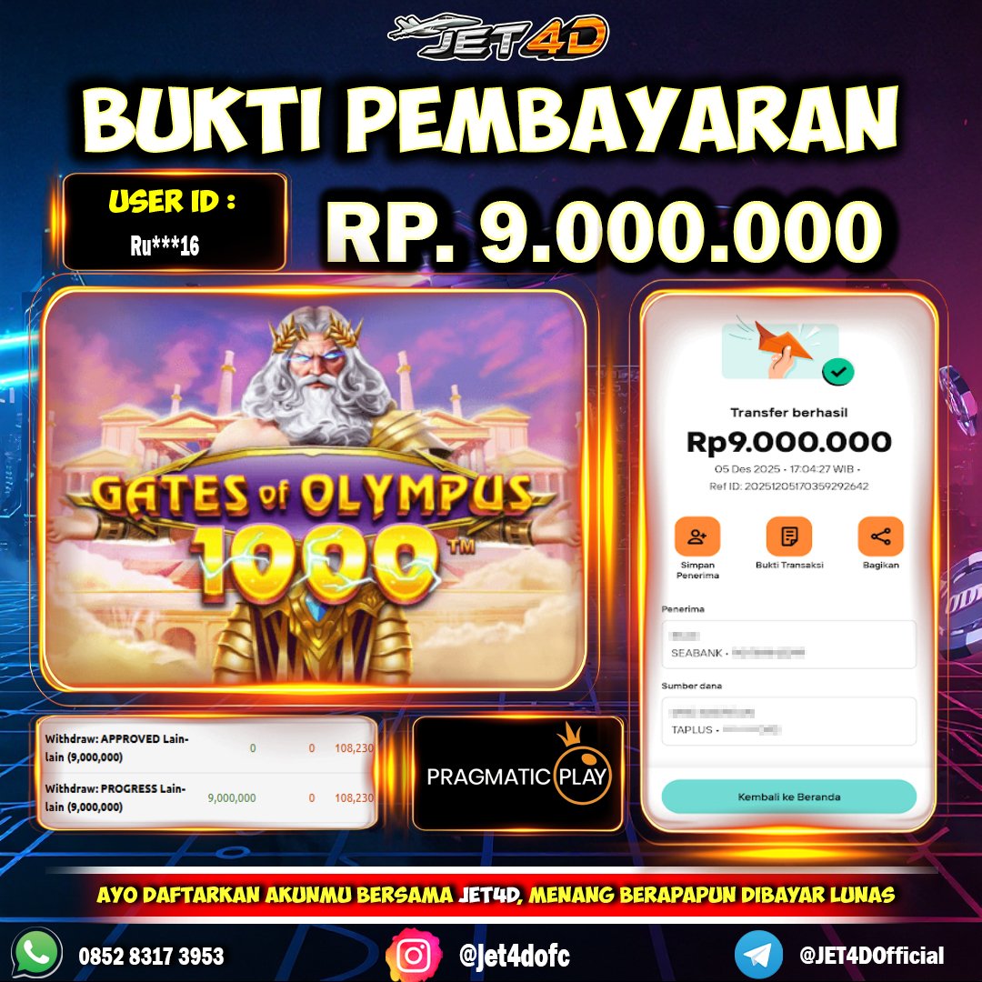 JET4D SAMBARAN ZEUS AUTO WEDE Selamat Kepada Member Setia Atas Withdraw Rp 9.000.000 Hari ini. List member yang sebelumnya mendapatkan withdraw besar bisa cek Disini dan di LINK ini.pelanyanan nonstop