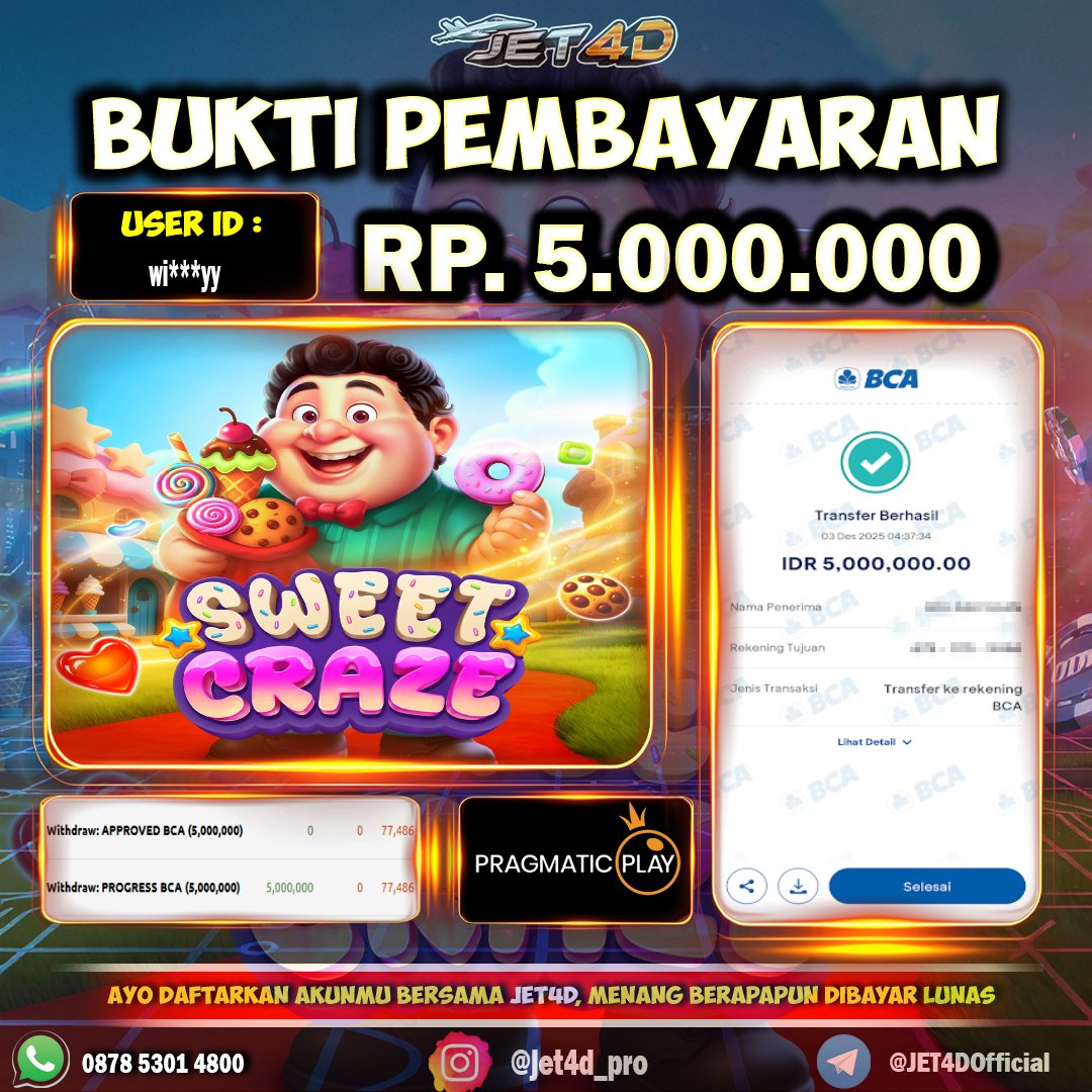 JET4D DUNIA PERMEN BANJIR SCATTER Selamat Kepada Member Setia Atas Withdraw Rp 5.000.000 Hari ini. List member yang sebelumnya mendapatkan withdraw besar bisa cek Disini dan di LINK ini.pelanyanan nonstop