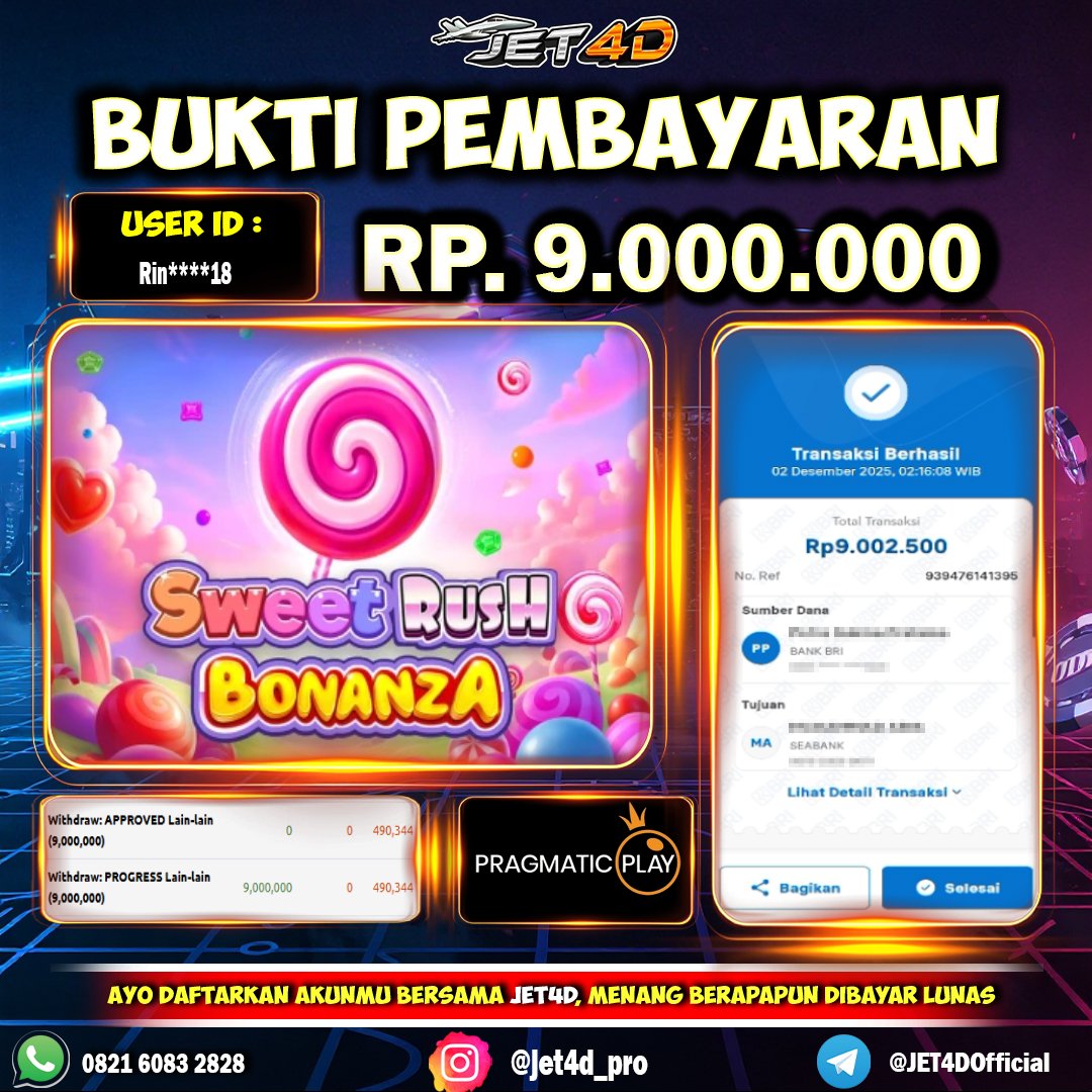 JET4D KASIH BUKTI BUKAN JANJI Selamat Kepada Member Setia Atas Withdraw Rp 9.000.000 Hari ini. List member yang sebelumnya mendapatkan withdraw besar bisa cek Disini dan di LINK ini.pelanyanan nonstop