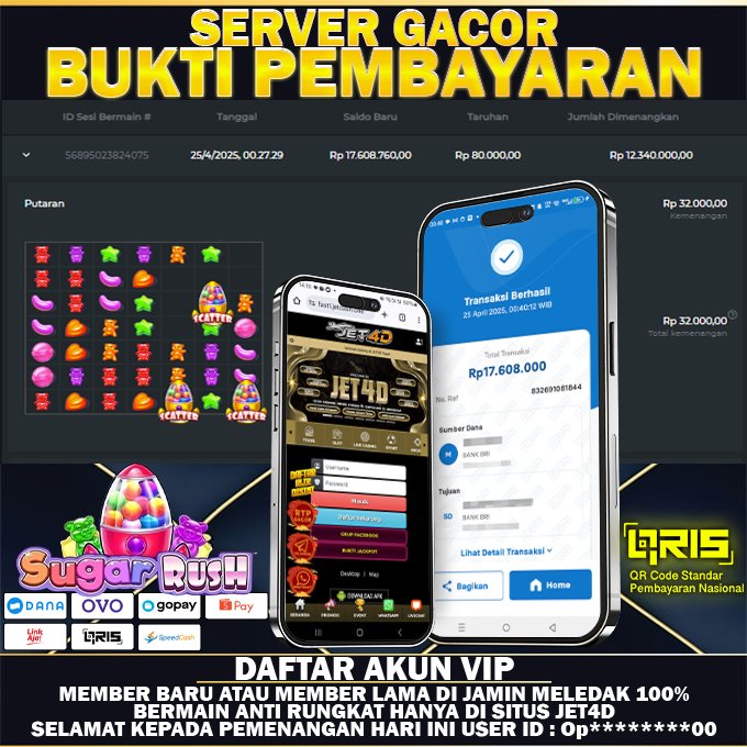 Slot JET4D adalah permainan judi yang biasanya dimainkan di mesin slot (slot machine) atau secara online. Berikut adalah penjelasan lebih rinci tentang slot: